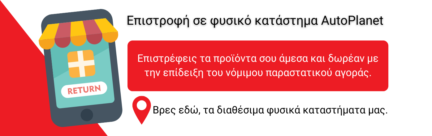 Η επιλογή επιστροφής στο κατάστημα είναι διαθέσιμη τόσο για τις ηλεκτρονικές αγορές όσο και για τις αγορές που έχεις πραγματοποιήσει σε κάποιο φυσικό κατάστημα AutoPlanet πάντα με την επίδειξη απόδειξης αγοράς. Και σε αυτή την περίπτωση επιστροφής, θα πρέπει να πληρούνται οι προϋποθέσεις της επιστροφής και να έχει συμπληρωθεί και αποσταλεί η φόρμα επιστροφών, ώστε να επικοινωνήσει μαζί σου το τμήμα εξυπηρέτησης πελατών και να εγκρίνει την επιστροφή.